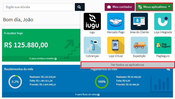 1. Na tela inicial do sistema GestãoClick, clique no botão “Meus aplicativos” > “Ver todos os aplicativos”;