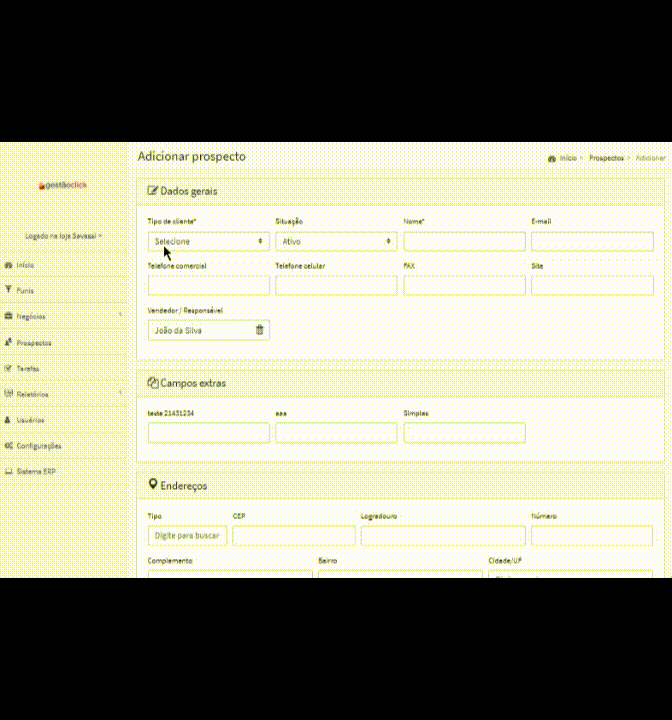 - Clique em “Prospectos” para cadastrar seus clientes em potencial. Além disso, o menu permite importar cadastros de uma planilha, exportá-los em Excel e excluí-los em massa.