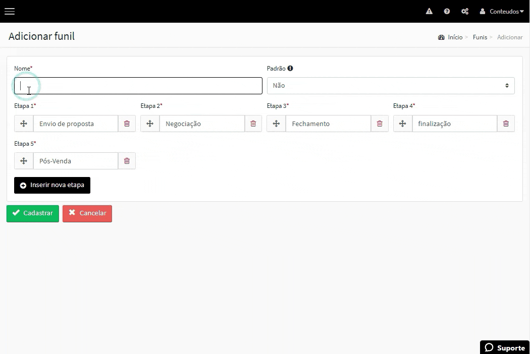 - Defina quantas “Etapas” terão o seu funil, que servirá como a estrutura do quadro “Kanban”, no qual é controlado o andamento do seu possível negócio;